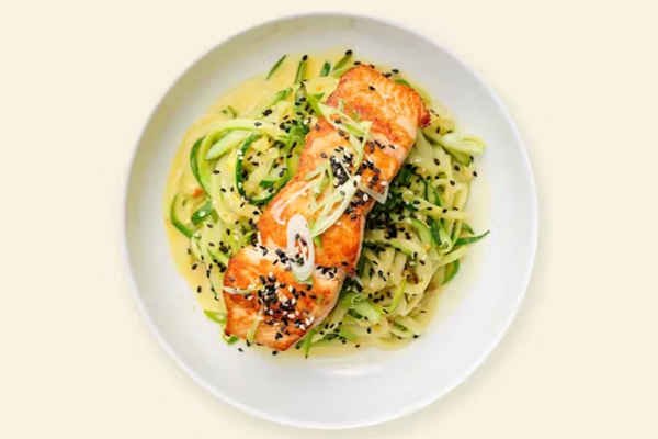 Wild salmon, zucchini noodles, coconut milk sofrito, spring onions, and mixed sesame seeds.